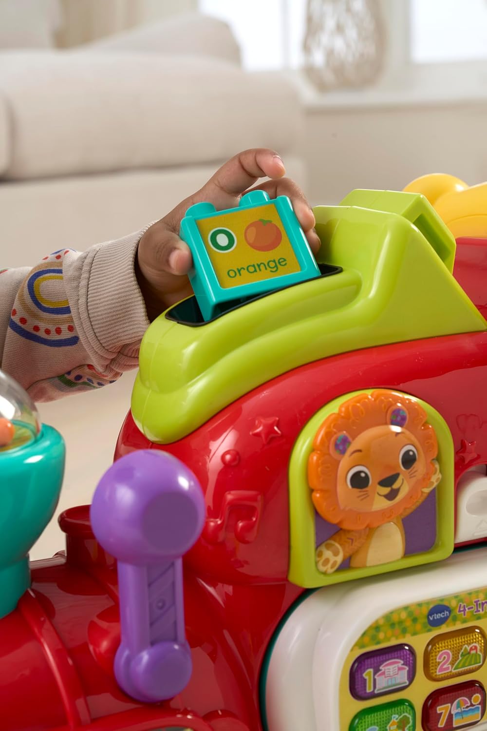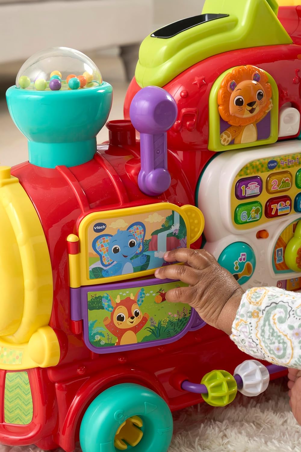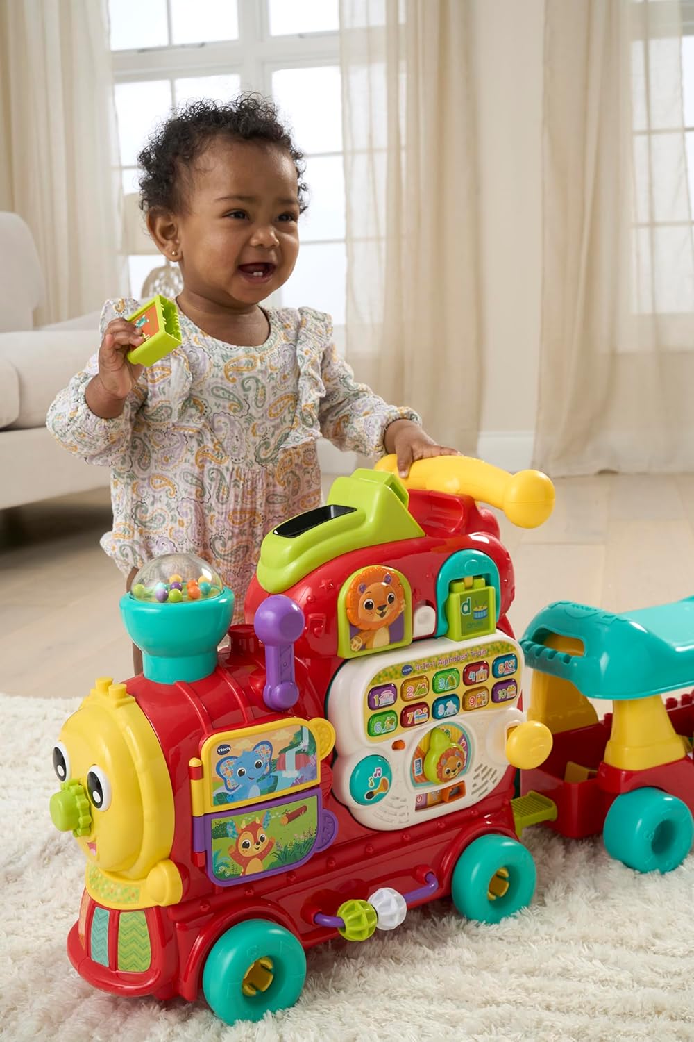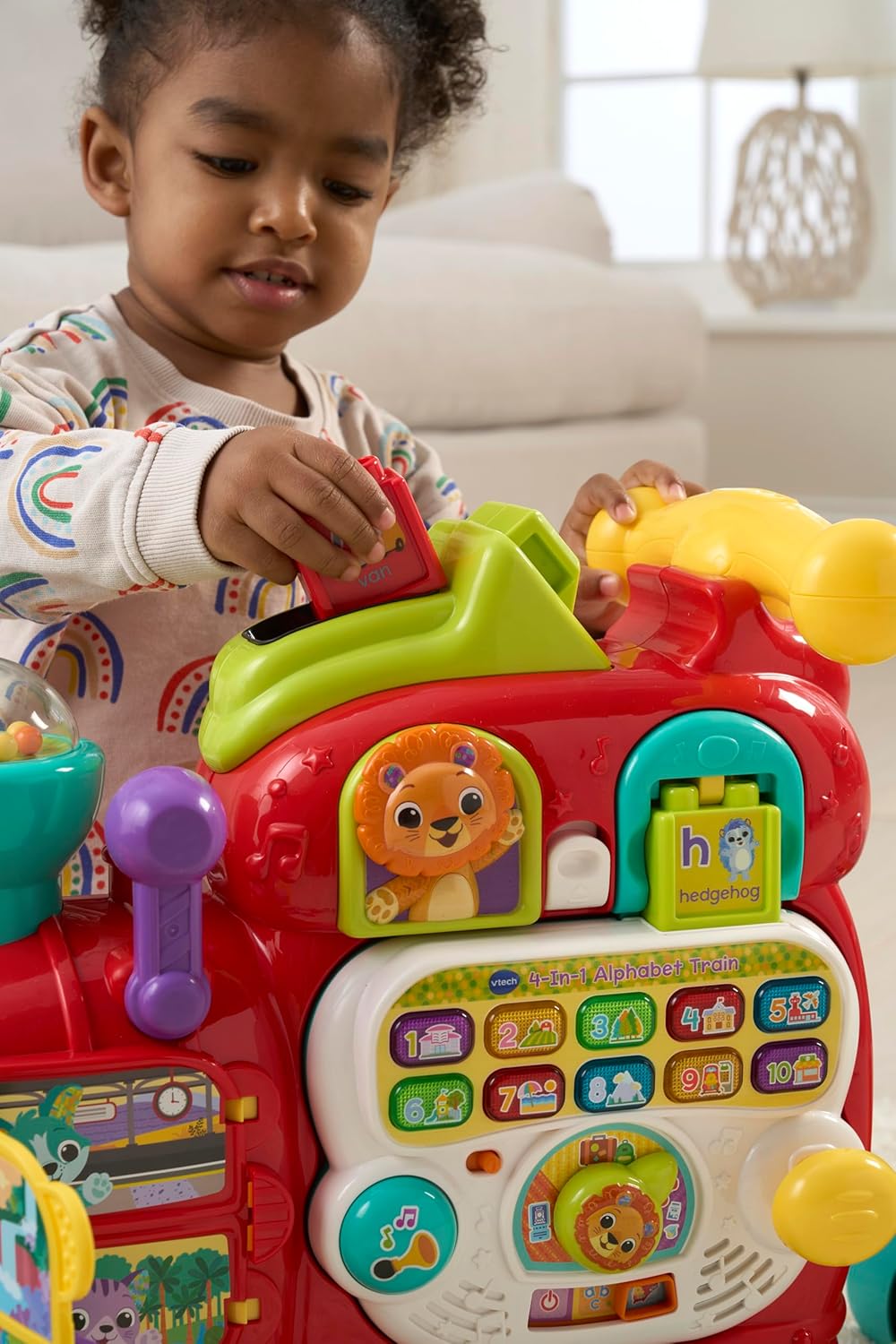 - 4-In-1 Alphabet Train includes modes for sit-down play, walker, pull-along wagon and ride on.