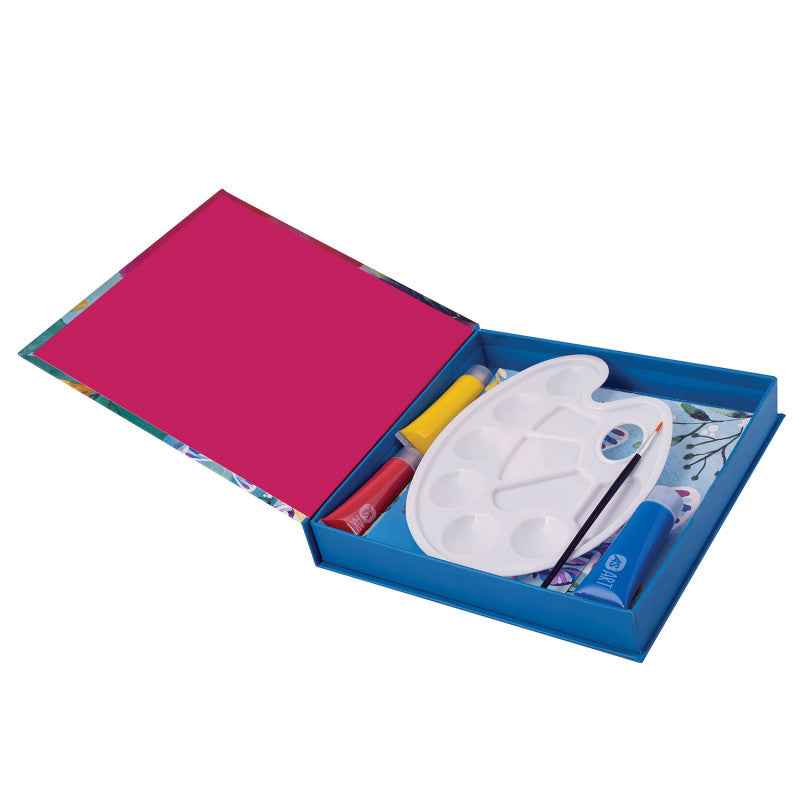 An educational painting set that includes detailed instructions to teach the child to paint with a brush and watercolors, creating impressive works of art to decorate their room. The 7 pre-printed and semi-colored postcards included create a series of graded difficulty for learning the colors and the technique of watercolor painting. The detailed illustrated guide included guides the child to start with simple coloring of one color to the easiest of the butterfly designs included, to using color mixes in the most difficult butterfly designs. In this way the child gets acquainted step by step with the use of the brush and creates works of art that look like real paintings. The child has fun, learns and works creatively, away from screens.