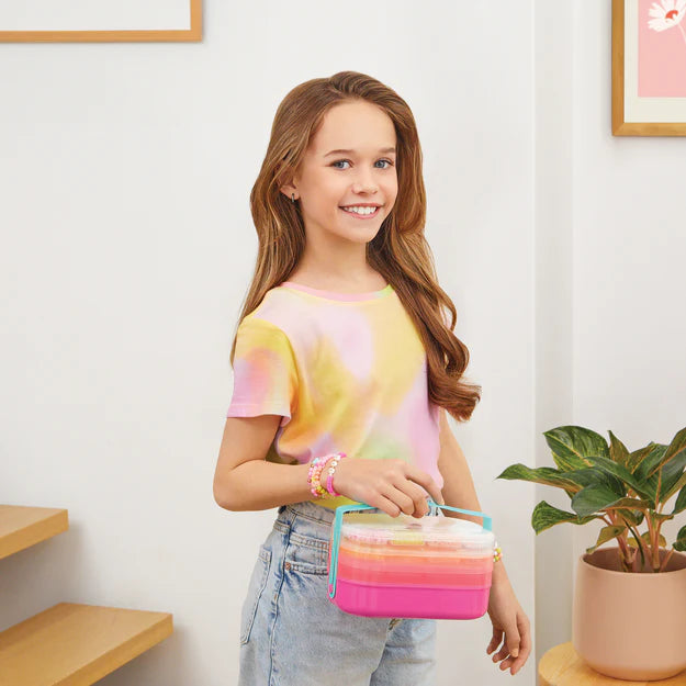 Get creative on the go! This bento box-style carry case will keep beads neat and organized during and in-between crafting sessions. The trays have helpful details molded in to help lay out bead patterns, measure cord length, and organize selected beads for stringing. Tweens can easily store all the materials and use the convenient handle to take the set with them to playdates, or to use wherever creativity strikes! This clever design comes complete with everything needed for a budding jewelry designer to start creating right away, from elastic and assorted nylon cords to 1370 stylish beads. Create jewelry to expand your accessory collection and trade with friends to spread the fun.