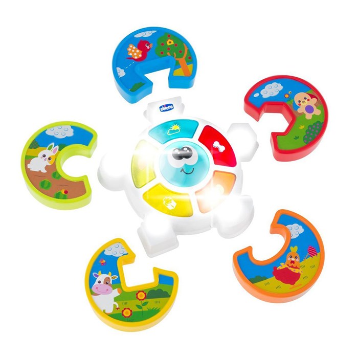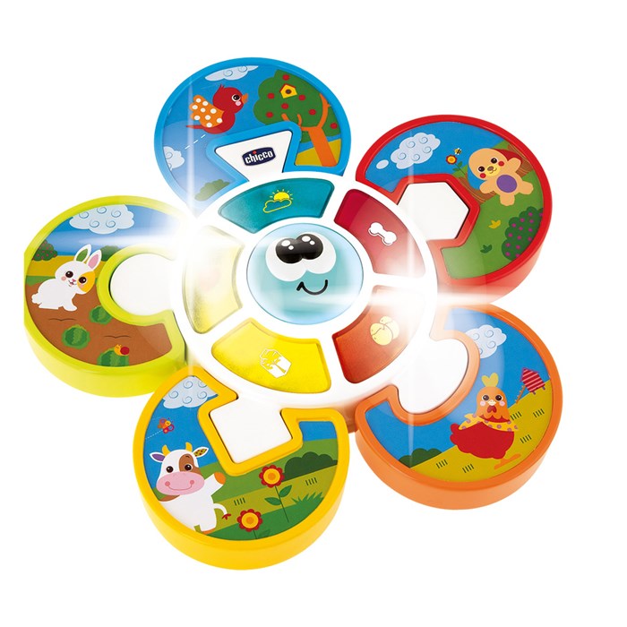 - By pressing the funny face a lights game starts with a fun jingle, once it ends, one of the 5 lights stays on, and the child has to find the corresponding puzzle's piece to the illuminated element