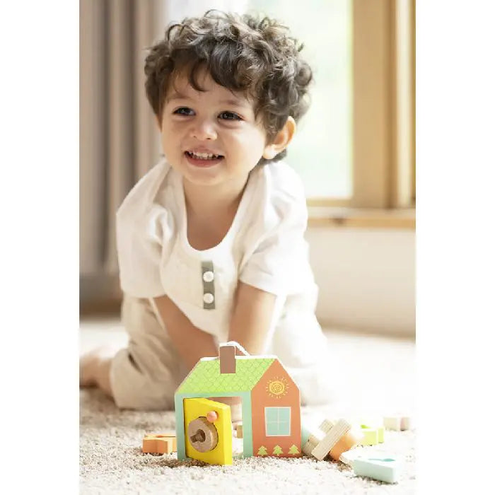 Locking Door is a shape sorting toy. Children can put the key through different shapes and experience opening the locking door with the wooden key. They will learn different shapes & patterns and practice their fine motor skills.