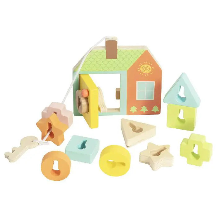 - Children can put the key through different shapes and experience opening the locking door with the wooden key.