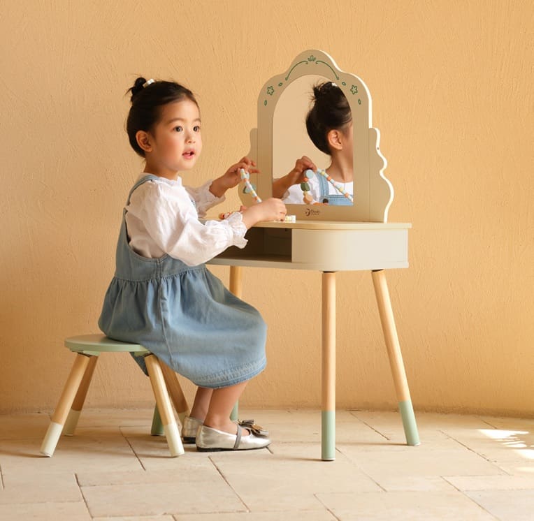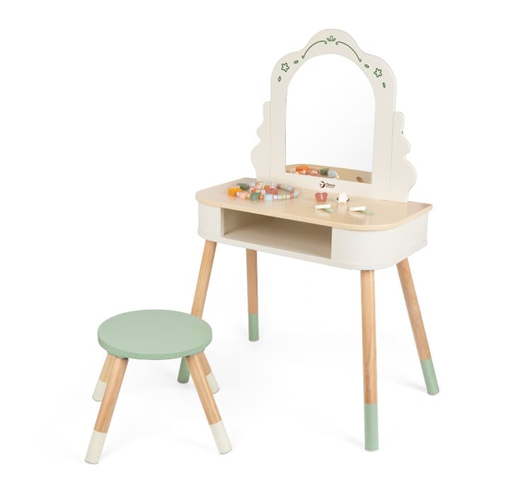 This dressing table with mirror is the perfect toy for girls aged 3 and up who dream of their own little corner for makeup and dressing up. The set includes a stool, necklace, bracelet, and hair clips. The wooden structure in pastel colors has a drawer for accessories, and play develops imagination, creativity, and manual dexterity.