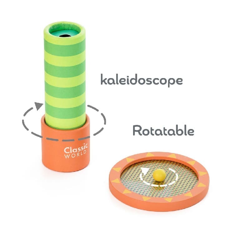 The Optical Experiments set contains a kaleidoscope, a diffraction grating box, rotating disk and a prism. In total the set consists of 16 items. The set is suitable for children from 3 years.