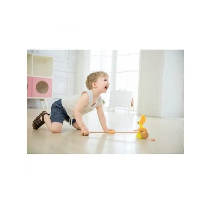 Push duck is a great toy for children to learn to walk – it encourages movement .