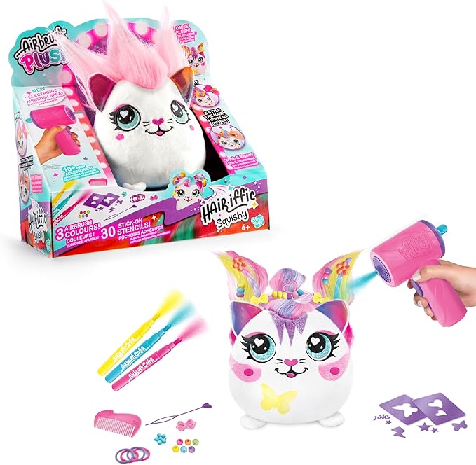 - Hair’iffic Squish Pals are soft, squishy plush toys with long, colourful hair you can decorate, style, and personalize over and over again! Use the battery-powered airbrush tool and 4 colourful chalk markers to give your Squish Pal a totally unique look. With 100+ reusable stick-on stencils, you can easily create fun, bold designs. When you're ready for a new look, simply wash with water and start fresh. Plus, the long hair can be braided, styled, and accessorized using included clips, beads, and a bead threader!