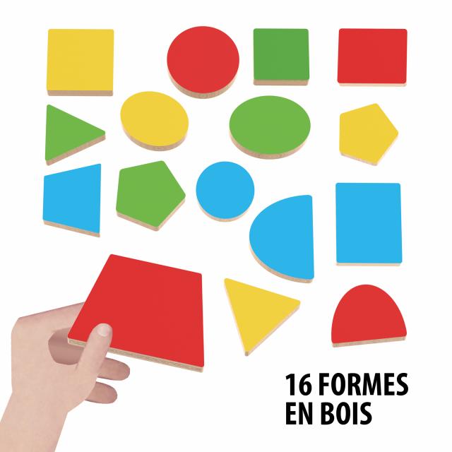 Touche les formes et choisis les bonnes ! Un établi sensoriel en bois avec des planches pédagogiques progressives à insérer, idéal pour développer le toucher, la manualité, la perception visuelle et la pensée logique. Observe la montgolfière, quelle forme a-t-elle ?