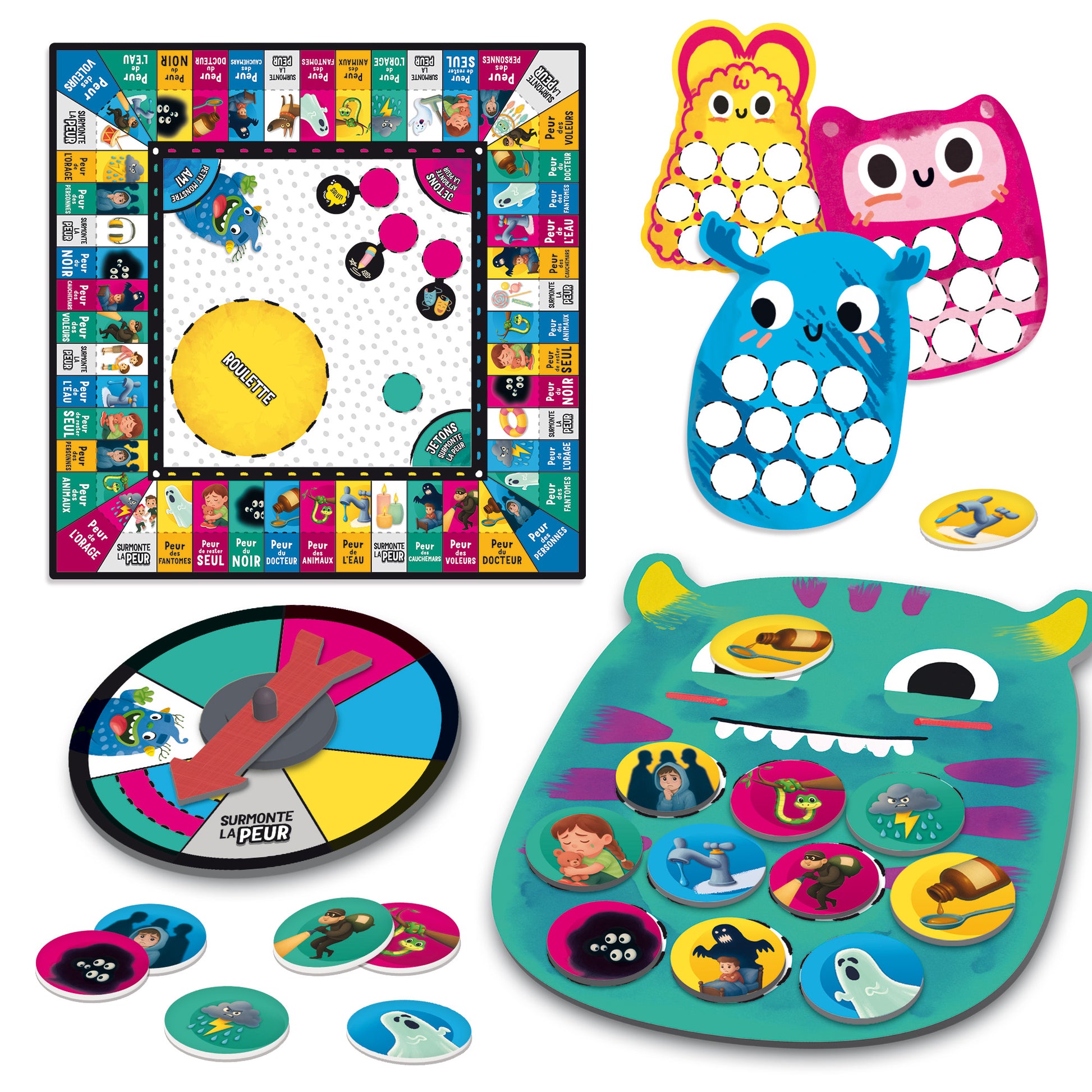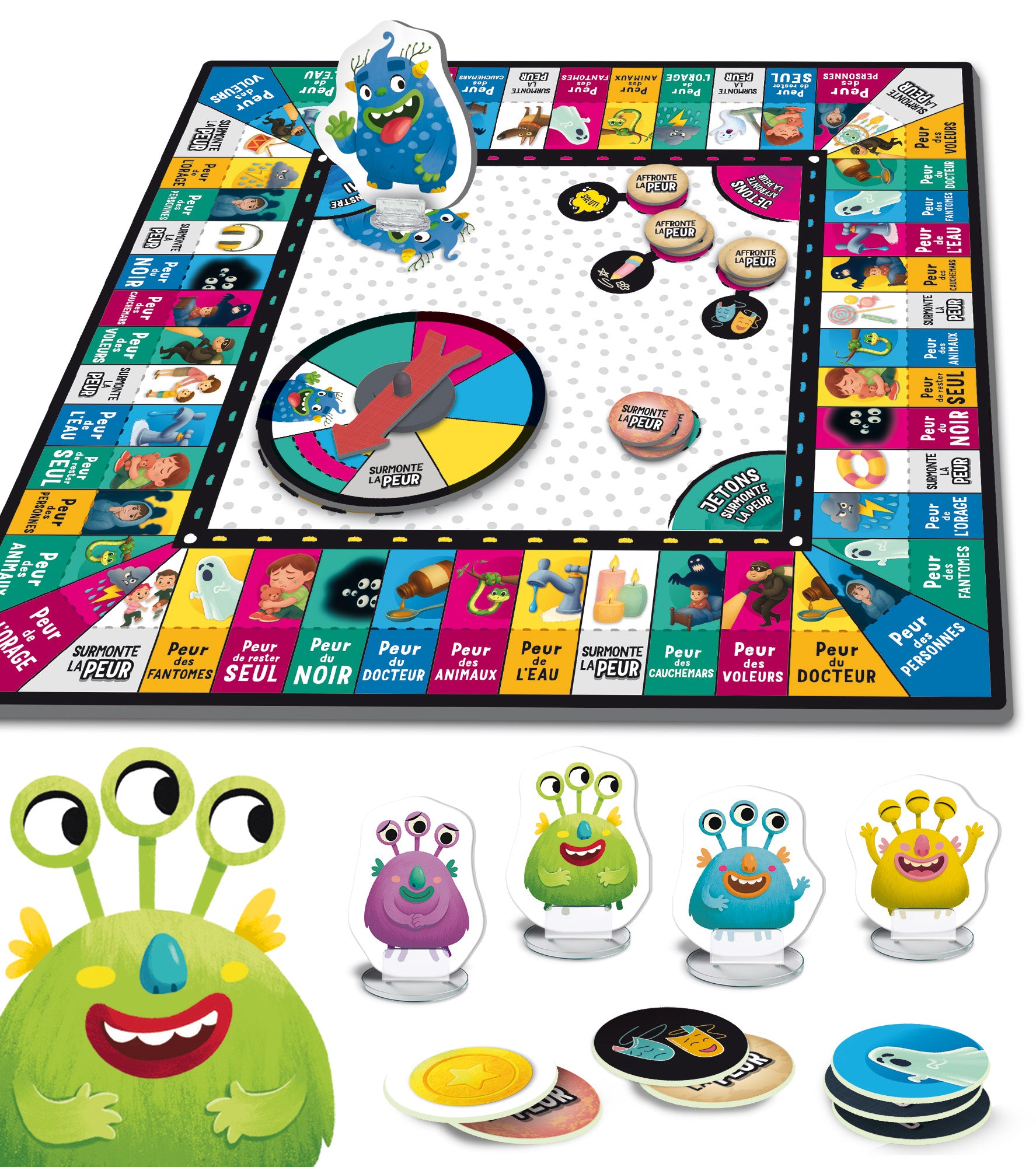 Un jeu de parcours original pour faire face à toutes les peurs de l’enfance avec le sourire, en compagnie d’adorables petits monstres amis. Grâce au mime, à la parole et au dessin, surmonter tes peurs devient un JEU HYPER AMUSANT, à faire entre amis ou en famille !