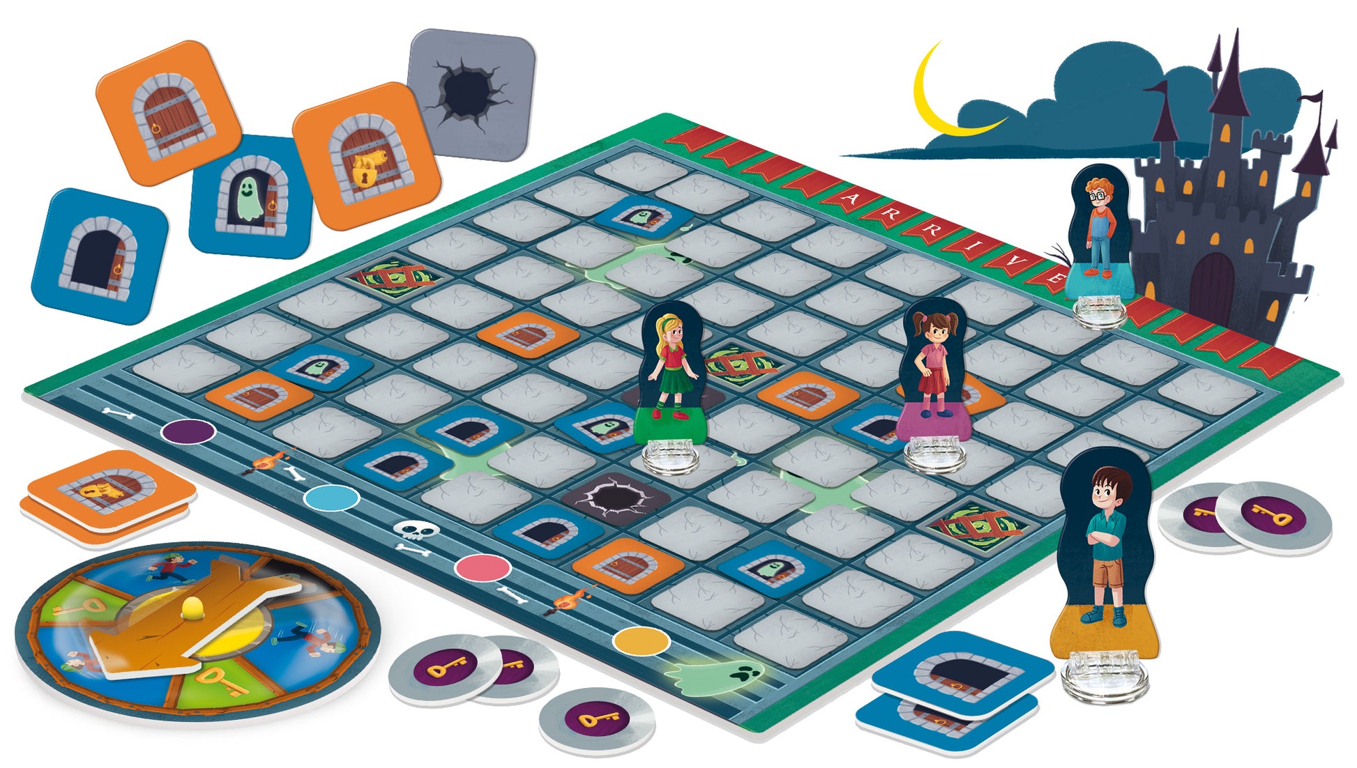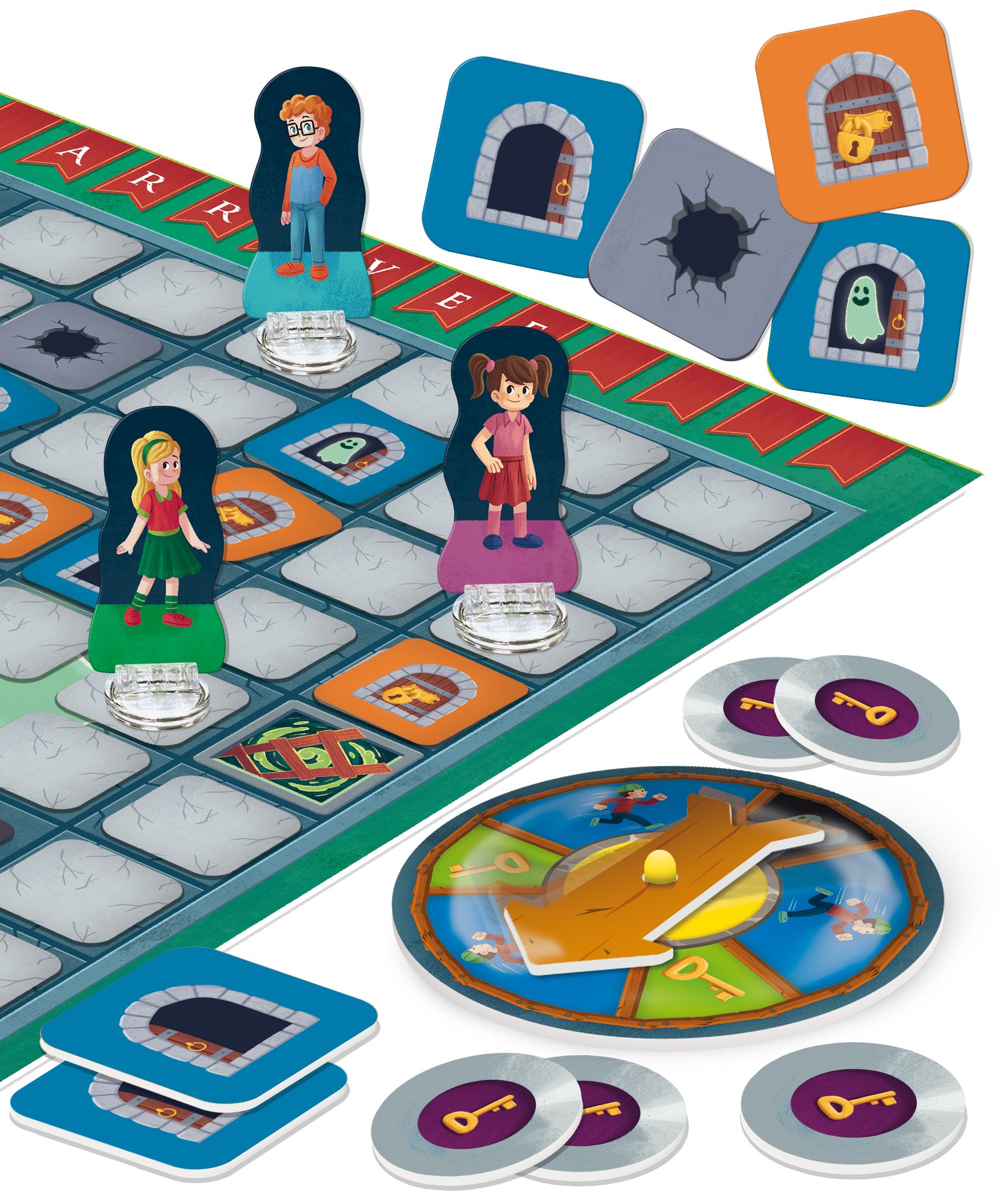 Tableau • Marque-places • Supports de cartes • Cartes • Jetons clés • Jetons fantômes • Roue avec flèche