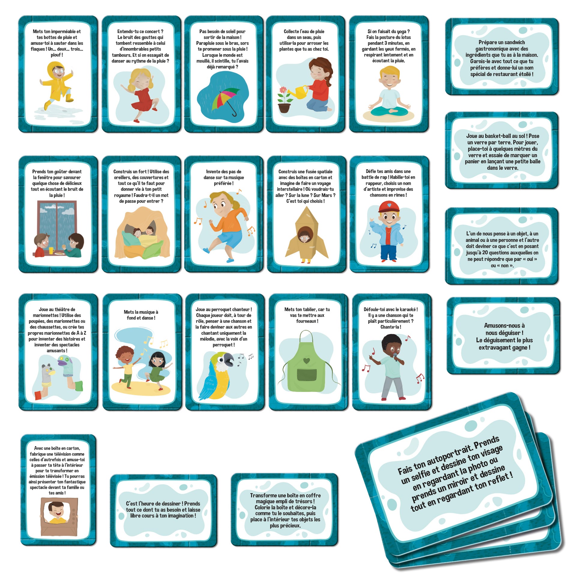Il pleut dehors... alors... qu’est-ce qu’on fait ? Ce kit contient beaucoup d’idées, toutes super amusantes ! Jeux, défis, fous rires et moments créatifs et imaginatifs : tu te rendras vite compte que les jours de pluie ne sont pas du tout ennuyeux et qu’il y a mille façons de s’occuper quand il pleut.