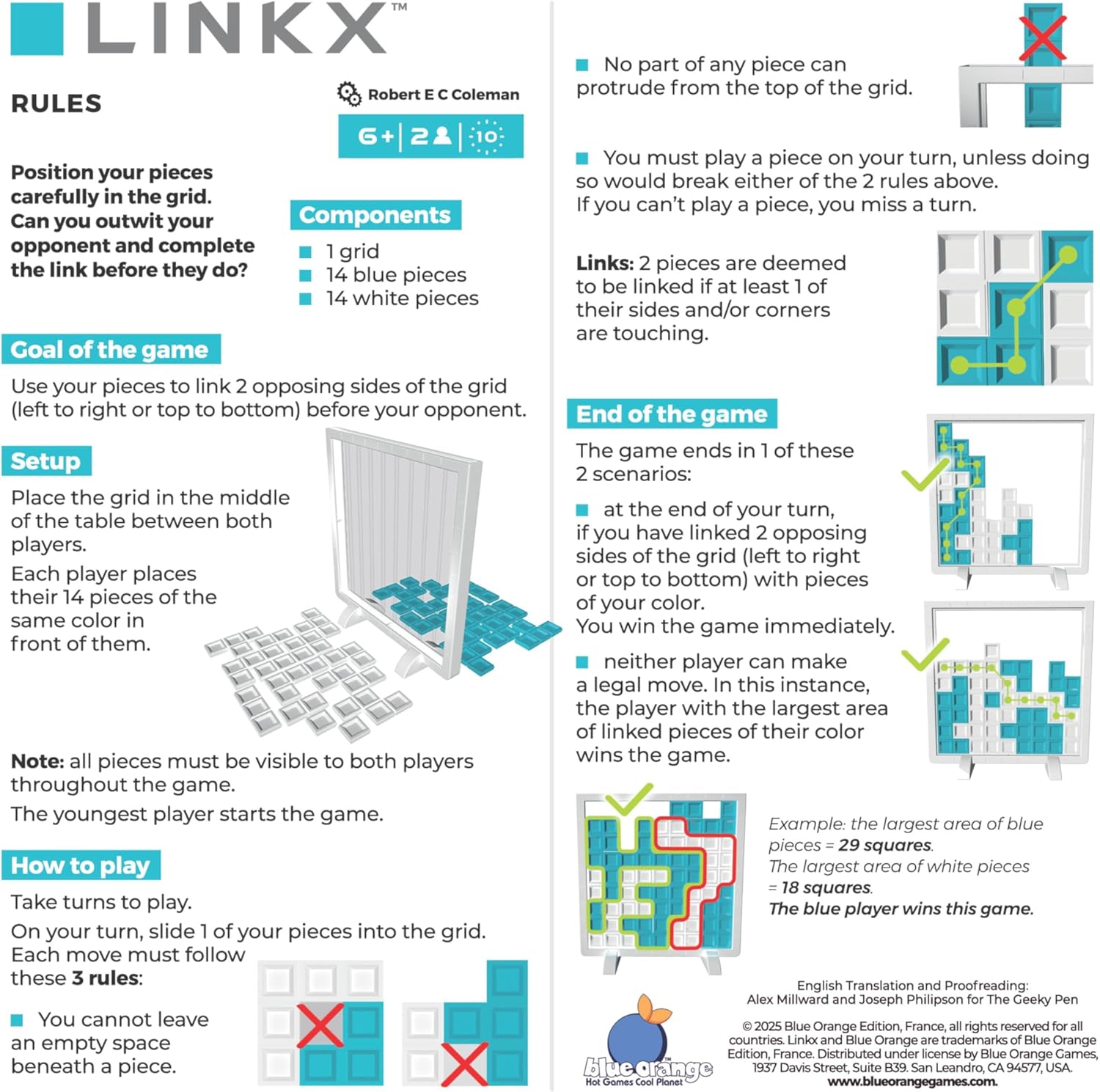 - Part of an award-winning collection: Linkx joins Blue Orange Games' collection of award-winning popular strategy games, which include, but are not limited to, Gobblet, Kingdomino, Photosynthesis, Battlesheep, Planet and the Next Station series.