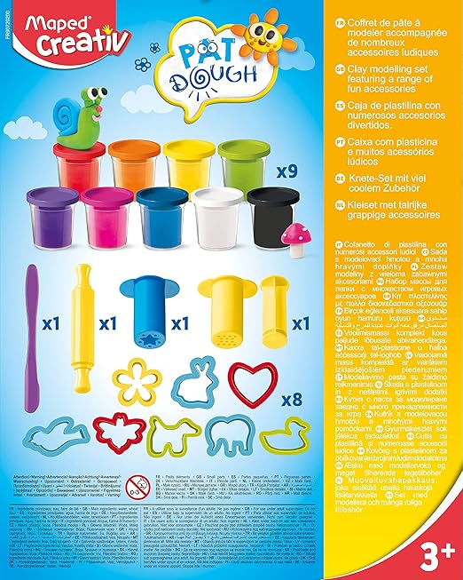 - 9 x 56g Pat'Dough Paste (White, Red, Yellow, Blue, Black, Orange, Purple, Green, Pink)