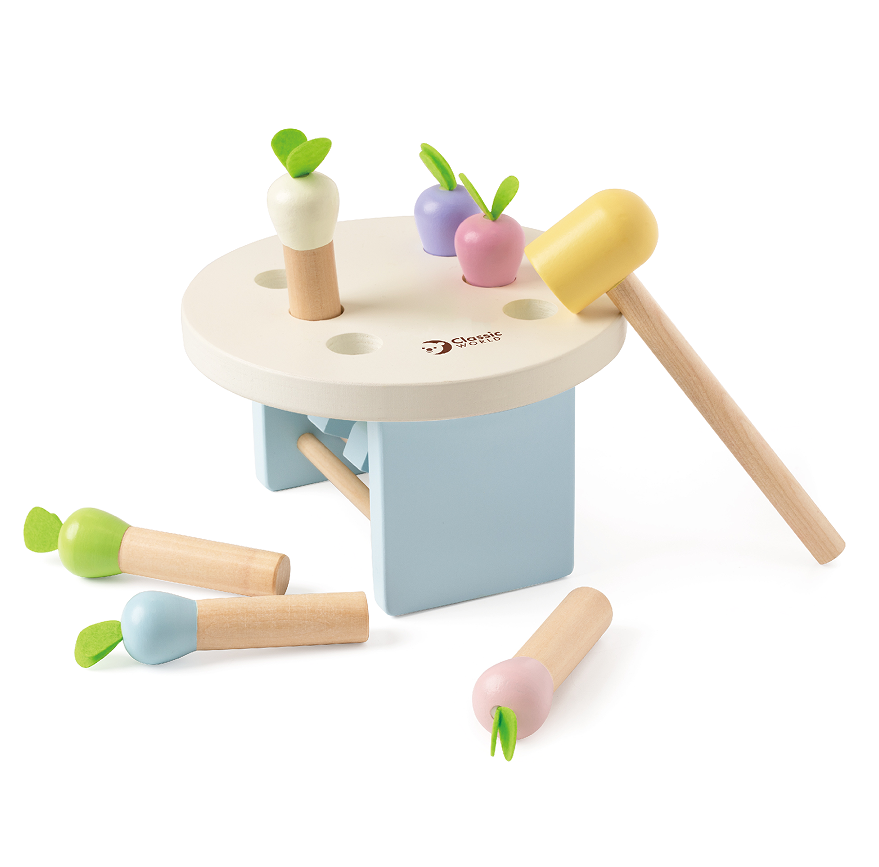 The pounding game cames with lovely carrots in different colours. Children can feel and learn the different results produced when they tap hard or softly, it can practise hand-eye coordination ahd also is fun to play.