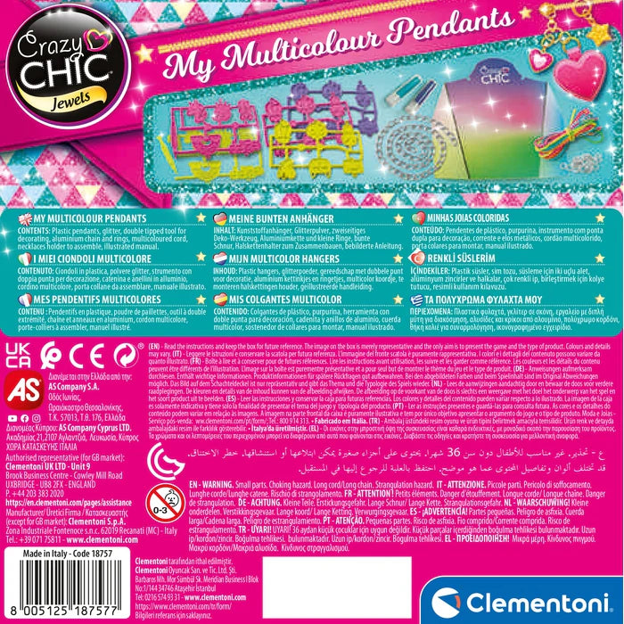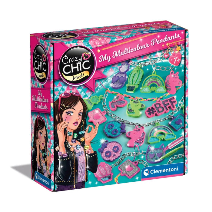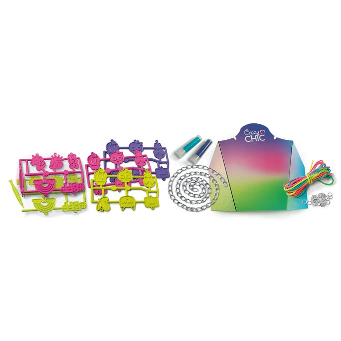 The set contains metal necklaces, bracelets and rings, attractive modern-style charms, a multicoloured cord and coloured glitter.