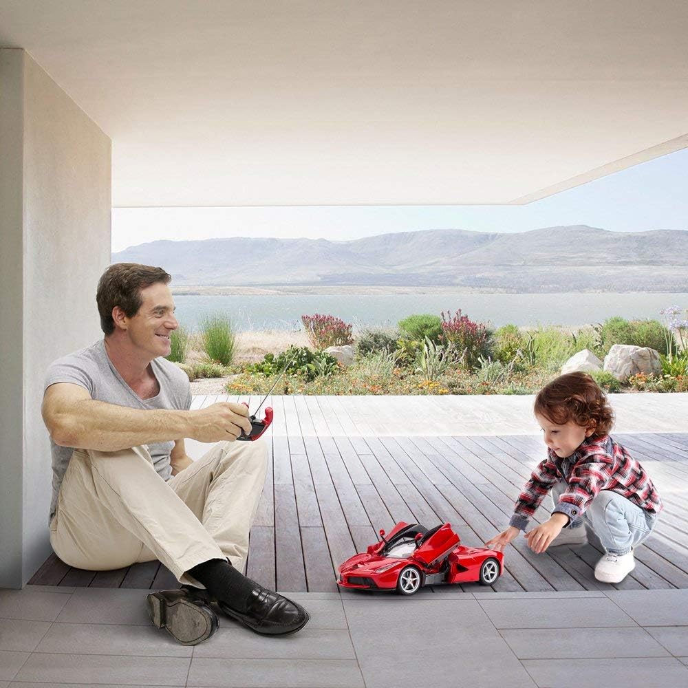 - Officially licensed by Ferrari and highly detailed interior/exterior: The 1:14 scale toy car measures 13.3 x 5.9 x 3.3 inches; it features butterfly doors (opened manually), headlights/taillights, integrated spring suspension system, differential mechanism, rims and tires, stereo system, steering wheel, leather seats, etc.