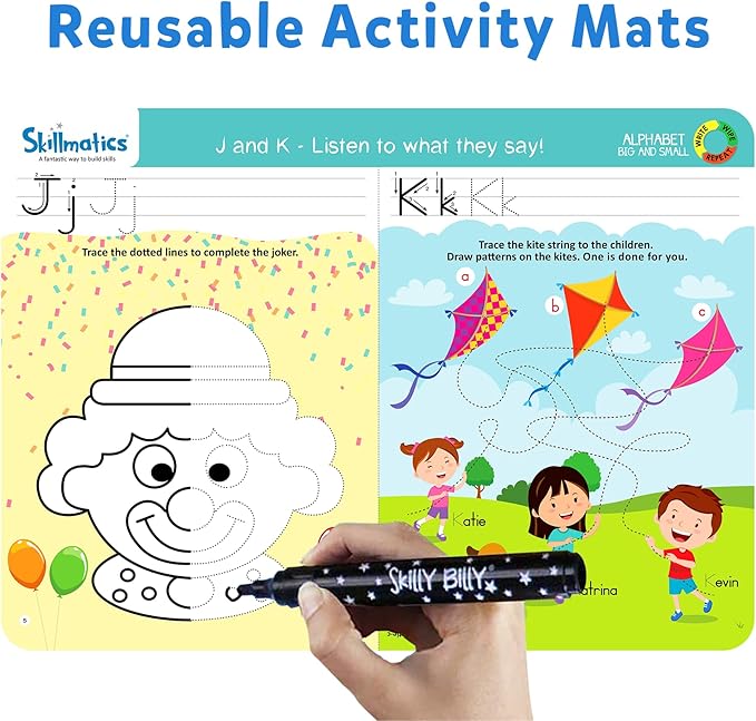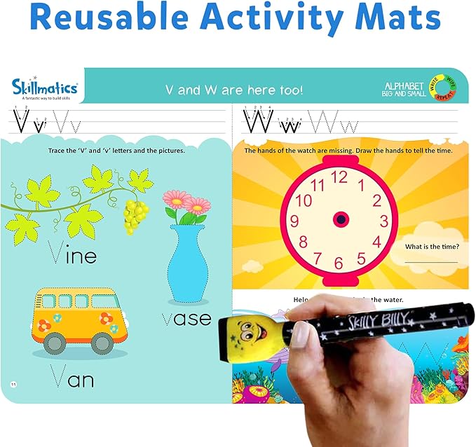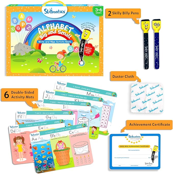 - Write-on, wipe-off activity mats: Includes 6 double-sided activity mats, 2 Skilly Billy pens, 1 wipe-off cloth, and 1 Skilly Billy achievement certificate. All activity mats include easy-to-understand instructions.