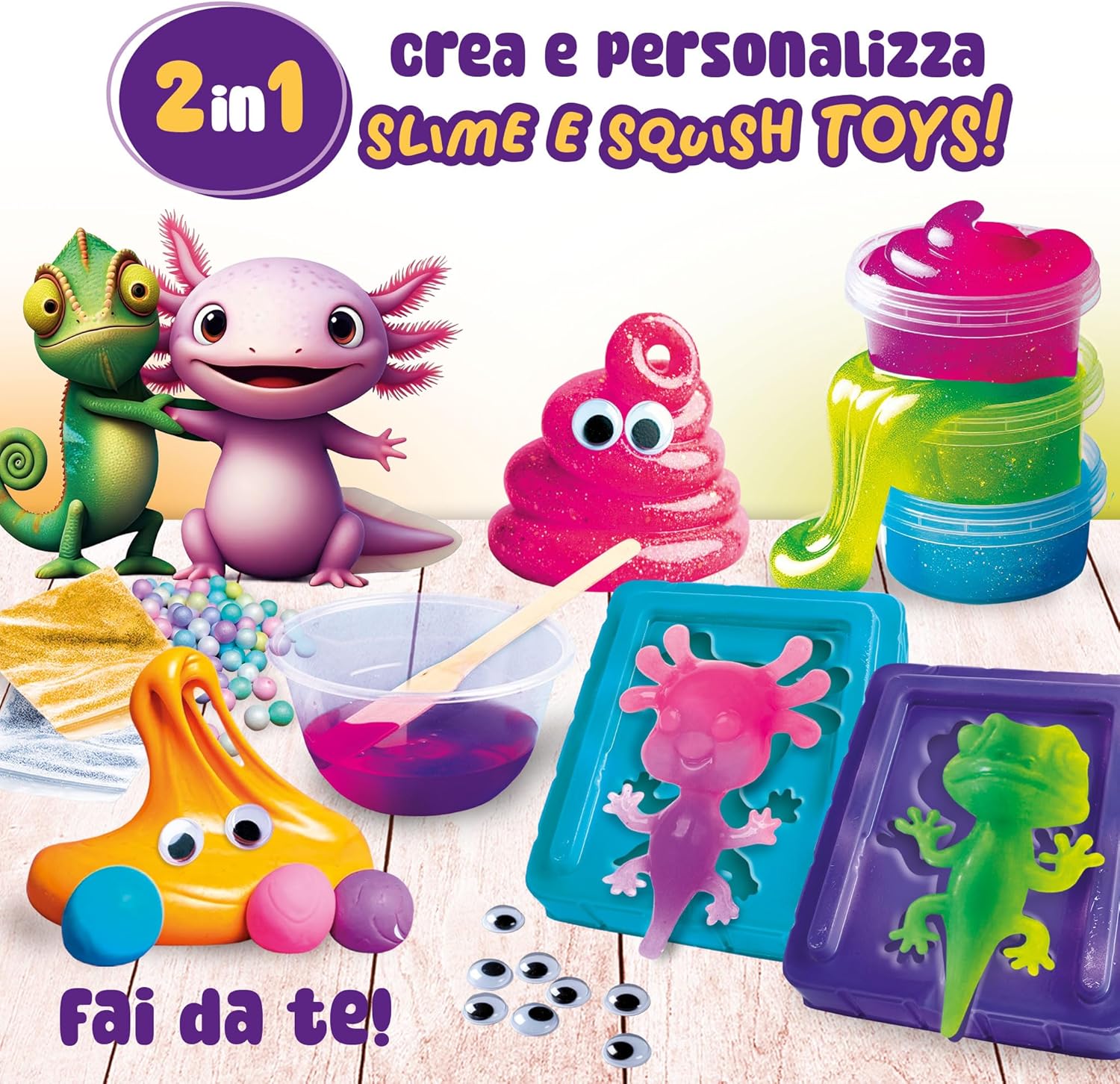 - Colle squish a, colle squish b, bols, spatules, couleurs, moules axolotl et caméléon, yeux en plastique, palettes argentées, palettes colorées, palettes holographiques, boules colorées, feuille double face, slime goo, super slime, super dough, butter slime, super putty, manuel illustré