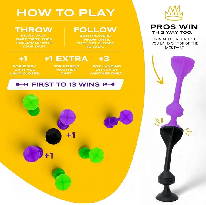 - How to Win: Jump into the fun of TOSSIT: Starter Pack Edition, where 2 players compete in a game of skillfully trying to land the closest dart to the black cat. Throw until you get your darts close to your opponents with the power twist of landing on top of other darts (Jumpover = +3 points), kissing another dart (+1 point), or knocking another dart out of the race. The closer your darts get to your opponent, the more points you'll score and the more bragging rights you'll earn.