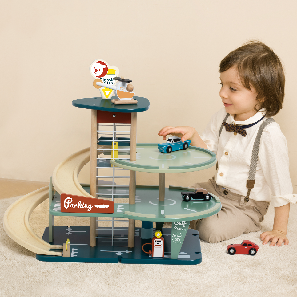 Inspired by the 50s, this garage recalls the golden age of the automobile! With its stylish cars, it offers a car wash, a fuel pump and bloplastic ramps to access the parking lot. The elevator serves all 3 levels and is topped by a platform with a helicopter. The base is equipped with connections to create a track. This toy develops fine motor skills and language. When played with others, it also helps develop social skills. The wood is FSC and the ramps are made of bioplastic.